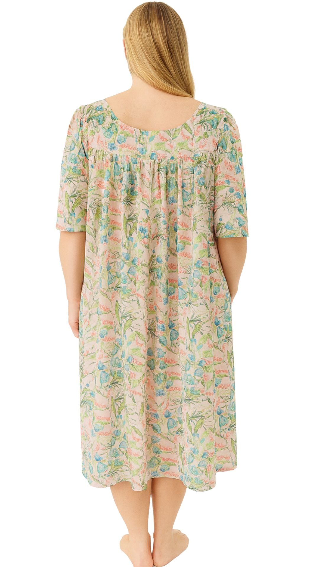A cheerful pink floral day dress or nightie to transport you into the dreamiest sleep comfortable oasis. Perfect for your next vacation, Damsel is travel friendly made with a lightweight and fabric.