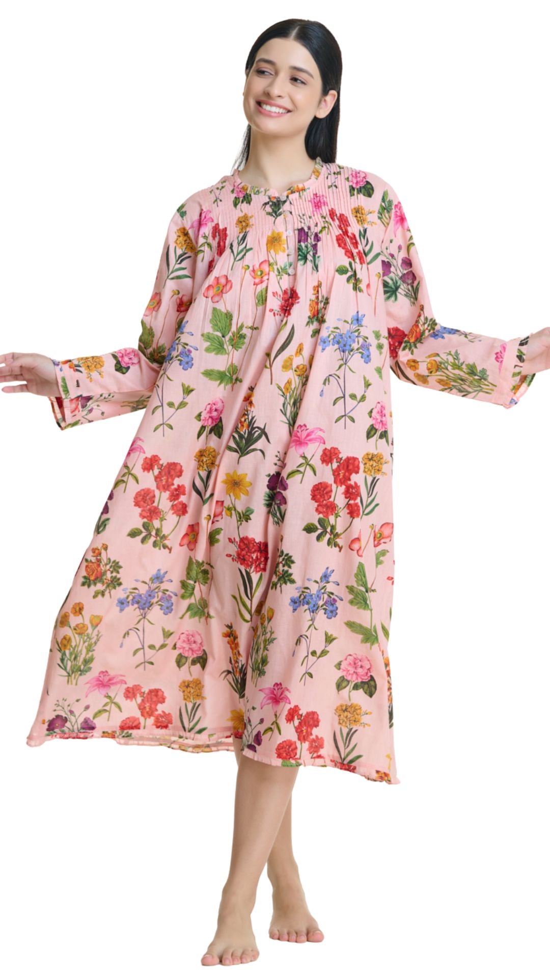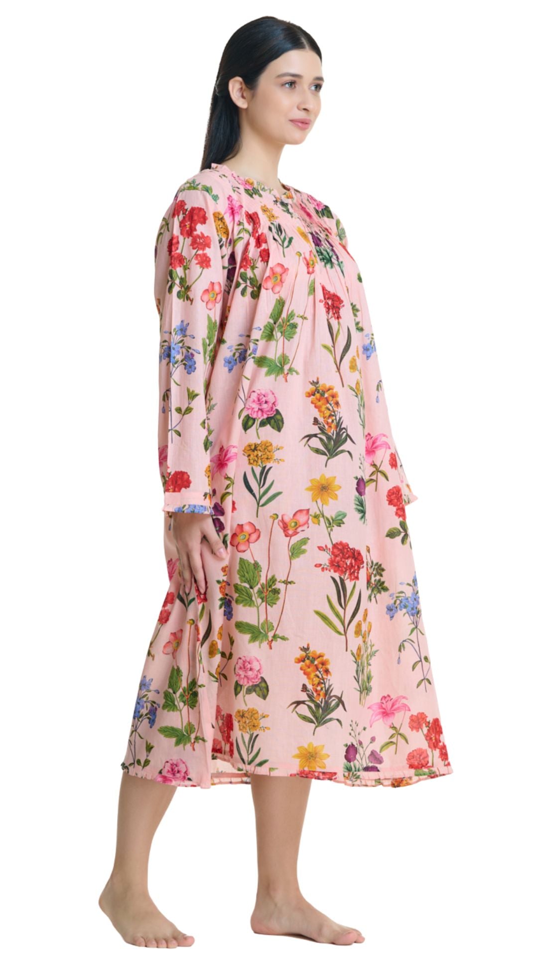 With secret garden embrace feminine floral elegance with this soft pink cotton nightie, perfect for dreamy nights and stylish lounging. She is designed with a flowy relaxed shilouhette for optimal comfort but also equipped with pleats across the bust to add shape and additional coverage where needed.