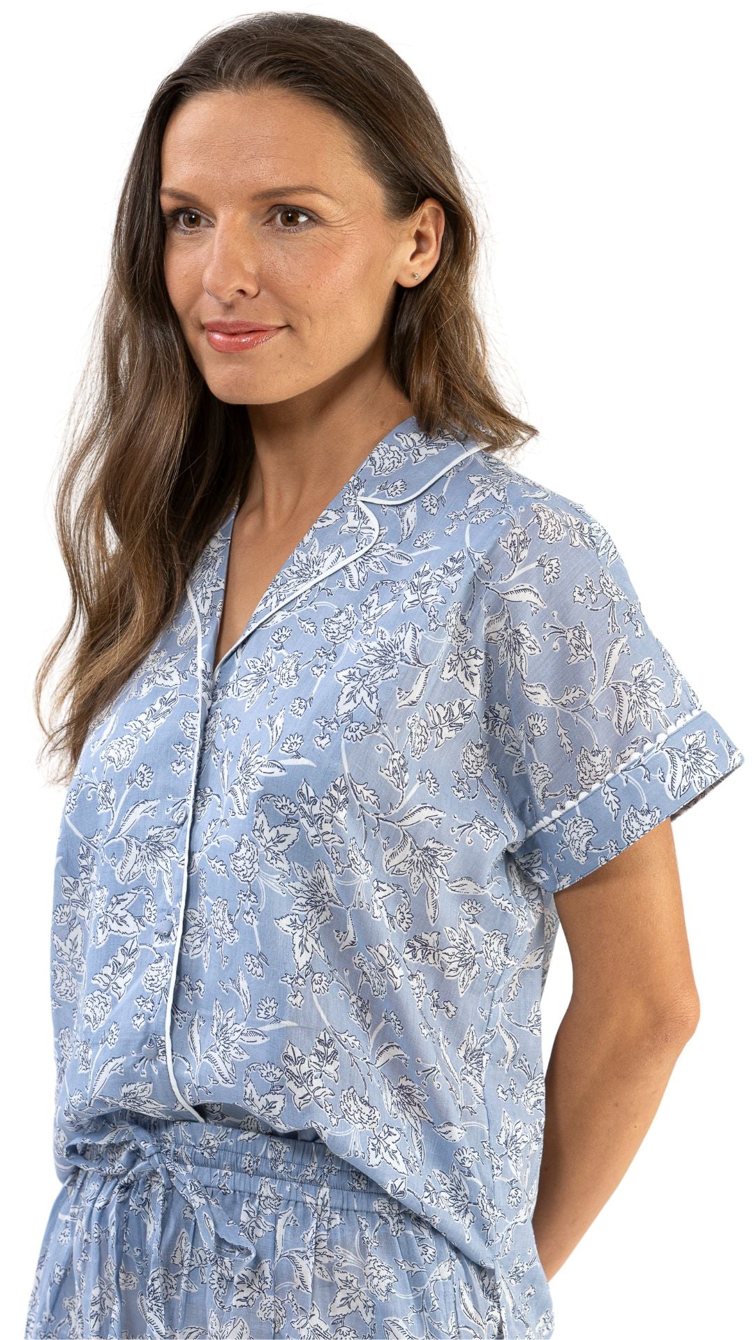 Enjoy the luxury feeling of cotton voile fabric, light as a feather on your skin. This set brings you comfort and style for the next summer or upcoming holiday and made with travel friendly lightweight fabric. She has perfectly tailored shorts that give you a little bit of extra length and coverage. The waist band is generous with an adjustable drawstring to provide the perfect fit for you. The top is designed with buttons down the front for easy wear with minimal effort. Our Pj sets can be washed on a cold machine wash or washed out in the sink/shower followed by an overnight dry.