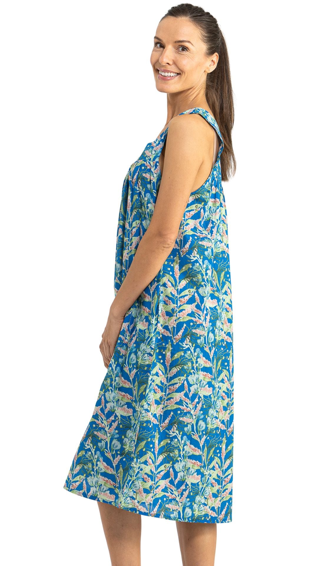 A cheerful and bright floral day dress or nightie to transport you into a comfortable oasis. Perfect for your next vacation, Blue Belle is travel friendly made with a lightweight and fabric.
