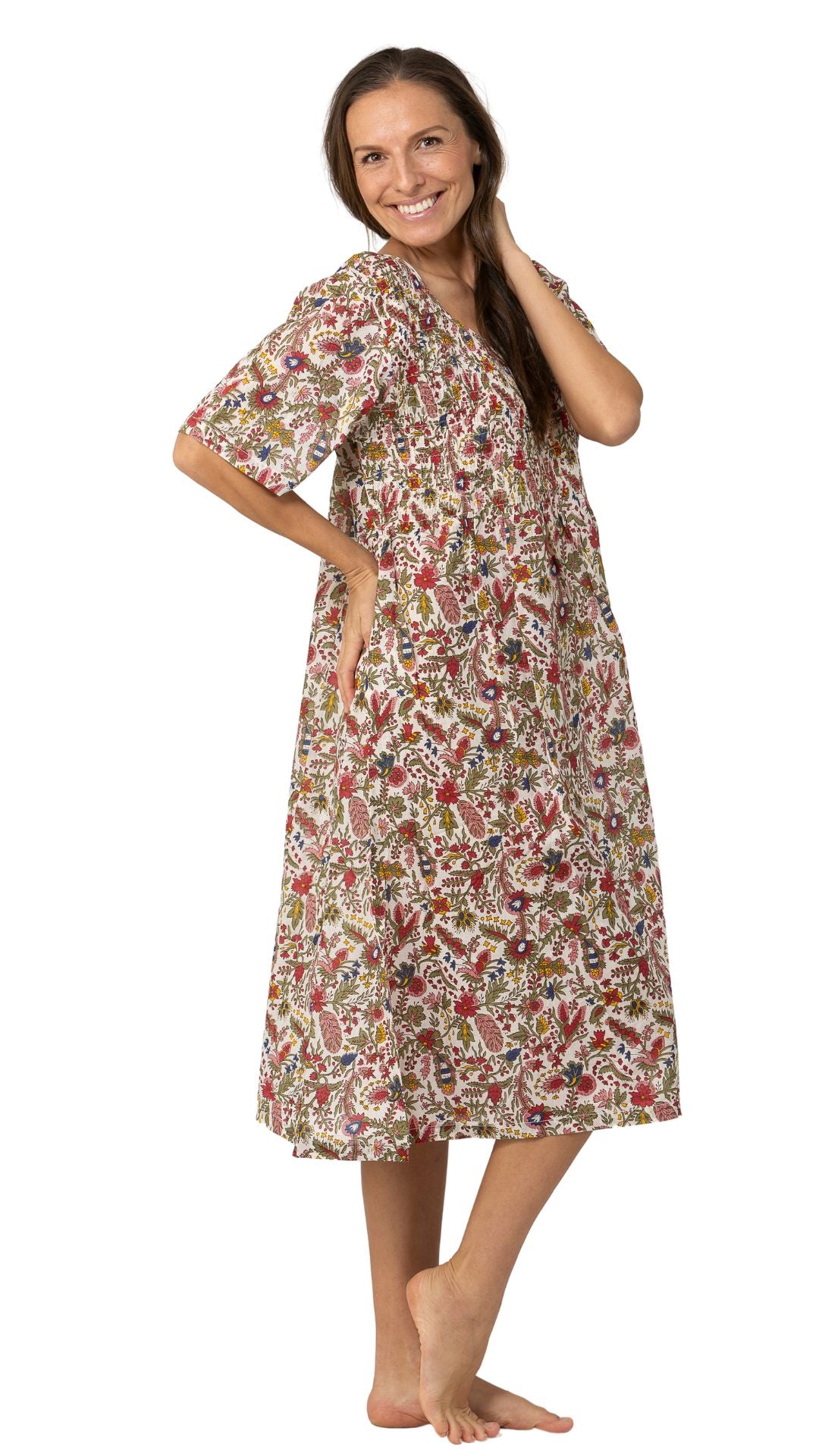 Versatile & Beautiful, wear Florence as a nightgown or a breezy house dress when you want to feel comfortable yet put-together at home.  She has a Relaxed, Roomy Fit that gently skims the body for a non-restrictive, easy-to-wear shape that feels light and effortless. She has shirring around the bust for additional support and comfort. She is made of a lightweight fabric perfect for travel and can be easily washed out in the shower or on a cold machine wash.