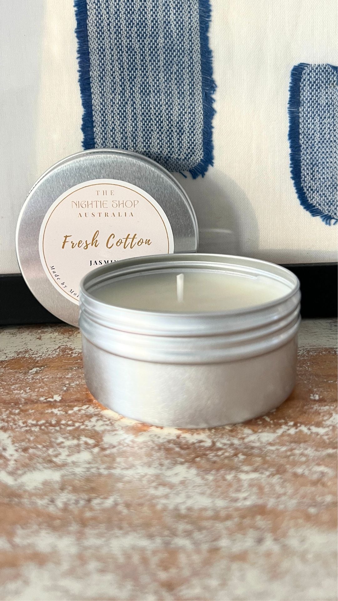 ✓   Our very own handmade Fresh Cotton Fragrance Candle in a travel tin